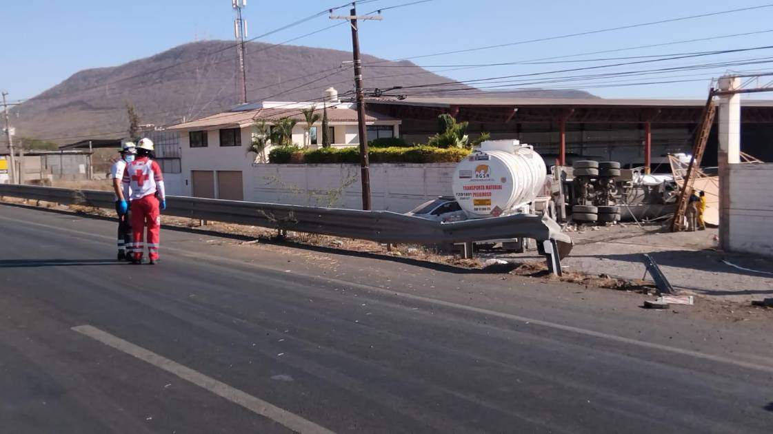 Elementos de Protección Civil y Bomberos Veteranos acudieron al lugar para realizar maniobras de rescate y aseguraron el área debido a una fuga de combustible procedente del tanque de la pipa.