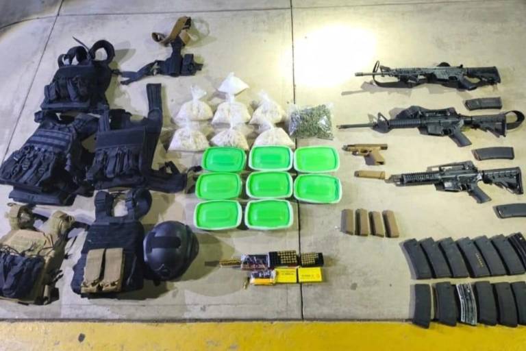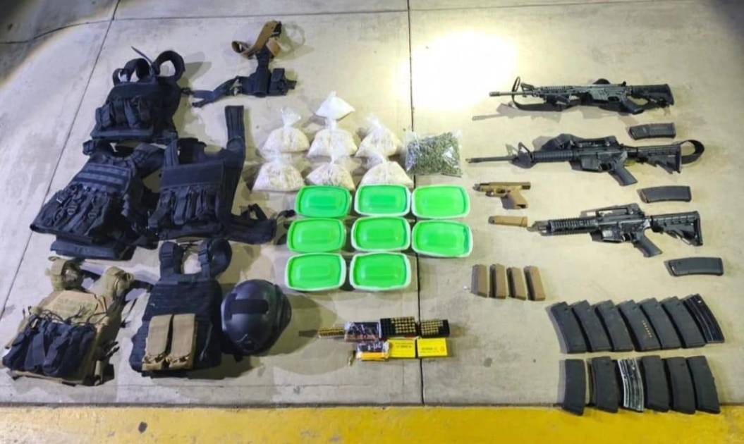 Al arribar, los sujetos se dieron a la fuga y dejaron abandonadas tres armas largas calibre .223, una pistola calibre 9 mm, 16 cargadores para fusil, cinco cargadores para pistola, cinco chalecos con placas balísticas, un casco tipo Kevlar, seis bolsas de plástico con cristal, con un peso aproximado de 420 gramos cada una, una bolsa de plástico con 300 gramos de cristal, ocho contenedores de plástico con 520 gramos de cristal, una bolsa de plástico con 200 gramos de marihuana, 240 cartuchos calibre .223, 100 cartuchos calibre 9 mm y una piernera para pistola con su fajilla.