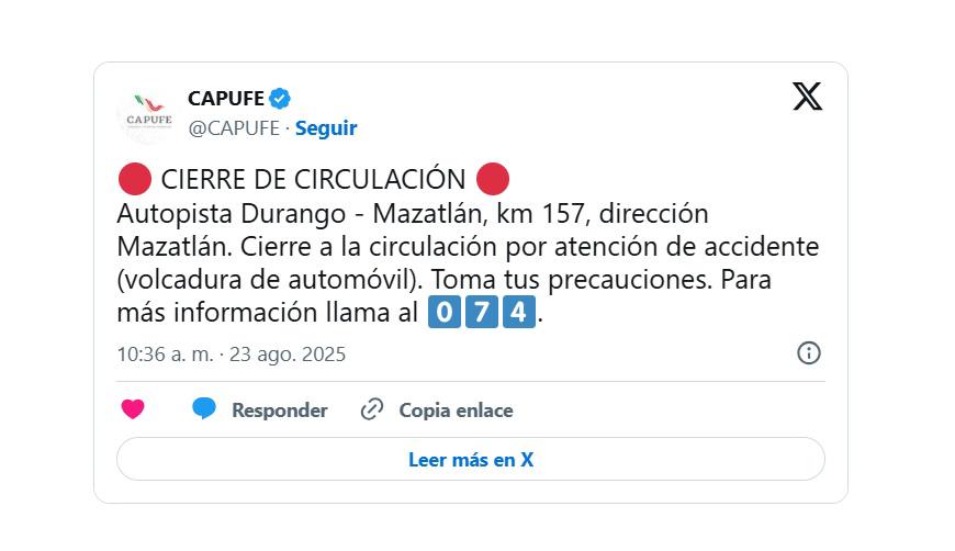 Por la volcadura de un automóvil, CAPUFE reportó el cierre de circulación en la Autopista Durango-Mazatlán.