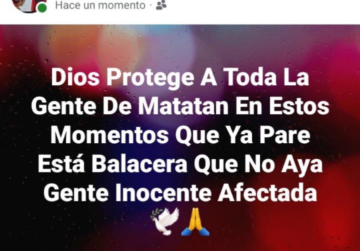 “Dios proteja a toda la gente de Matatán en estos momentos. Que ya pare esta balacera, que no haya gente inocente afectada”, señala el mensaje que rápidamente se ha propagado entre la ciudadanía.