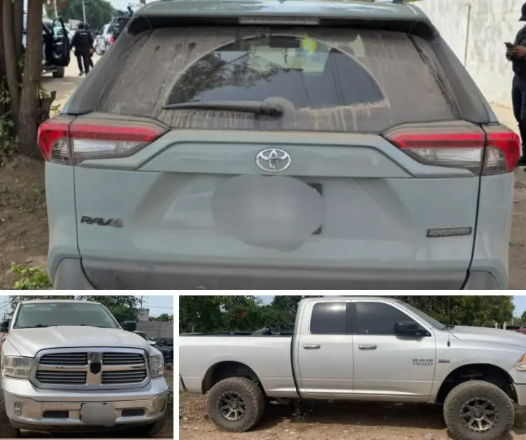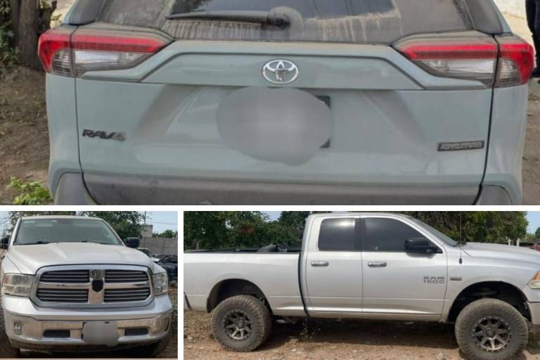 Entre lo asegurado se encuentra un automóvil Nissan Versa, modelo 2017, color acero; un Toyota RAV4, modelo 2021, color verde; y una camioneta Dodge RAM, modelo 2014, color gris, la cual había sido reportada como robada en la ciudad de Fresno, California, en Estados Unidos.