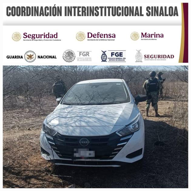 Por último, en una brecha del municipio de Elota, que conecta los poblados de Tanques y Alta Rosa, personal militar localizó un Nissan Versa abandonado. El vehículo había sido reportado como robado un día antes en la autopista, por lo que fue puesto a disposición de las autoridades competentes.