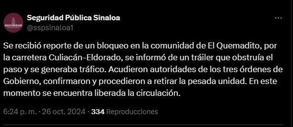 La Secretaría de Seguridad Pública de Sinaloa confirmó el hecho e informó sobre la liberación del paso.