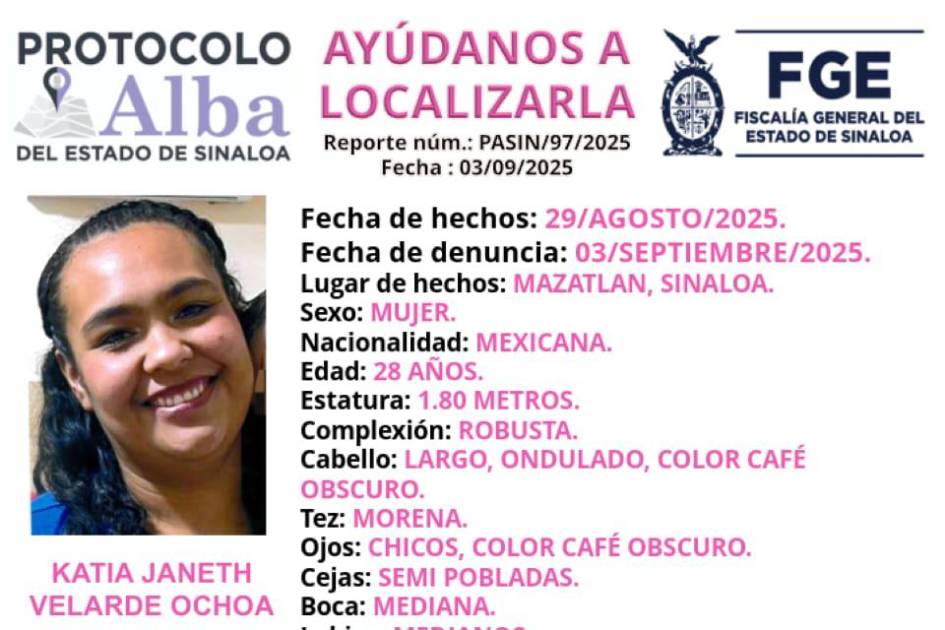 MAZATLÁN._ La Fiscalía General del Estado de Sinaloa activó el Protocolo Alba para la búsqueda de Katia Janeth Velarde Ochoa, de 28 años, desaparecida en Mazatlán.