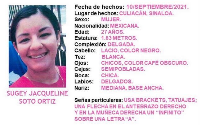 “El día 10 de septiembre de 2021, familiares tuvieron por última vez comunicación vía celular con Sugey Jacqueline Soto Ortiz, la cual reside en la colonia 6 de Enero, Culiacán, Sinaloa. Se considera que su integridad pudiera encontrarse en riesgo, toda vez que puede ser víctima de la comisión de un delito”, dice la ficha.