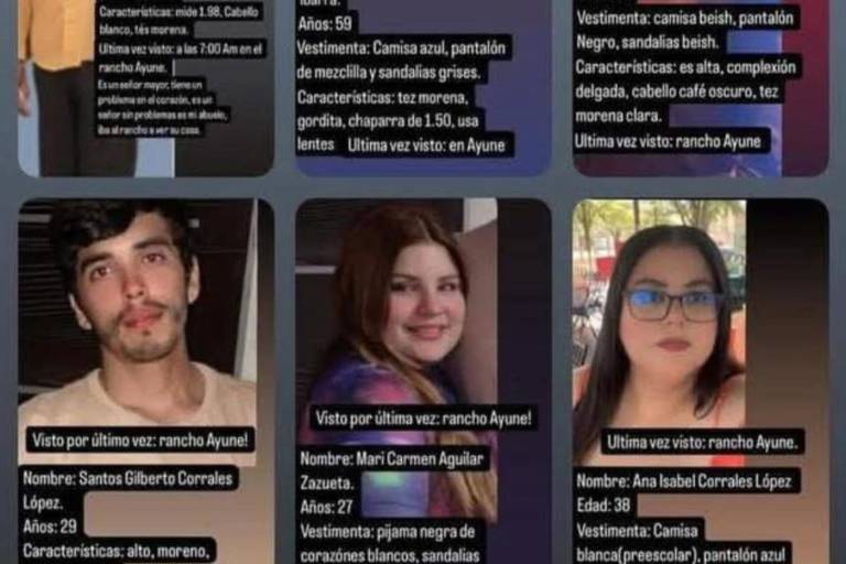 Las personas desaparecidas son Santos Gilberto, de 67 años, y Teresa de Jesús, de 59, los padres; sus hijas Ana Isabel, de 39, y Araceli, de 40 años; así como su hijo Santos Gilberto, de 28 años, y su esposa Maricarmen, de 27 años.