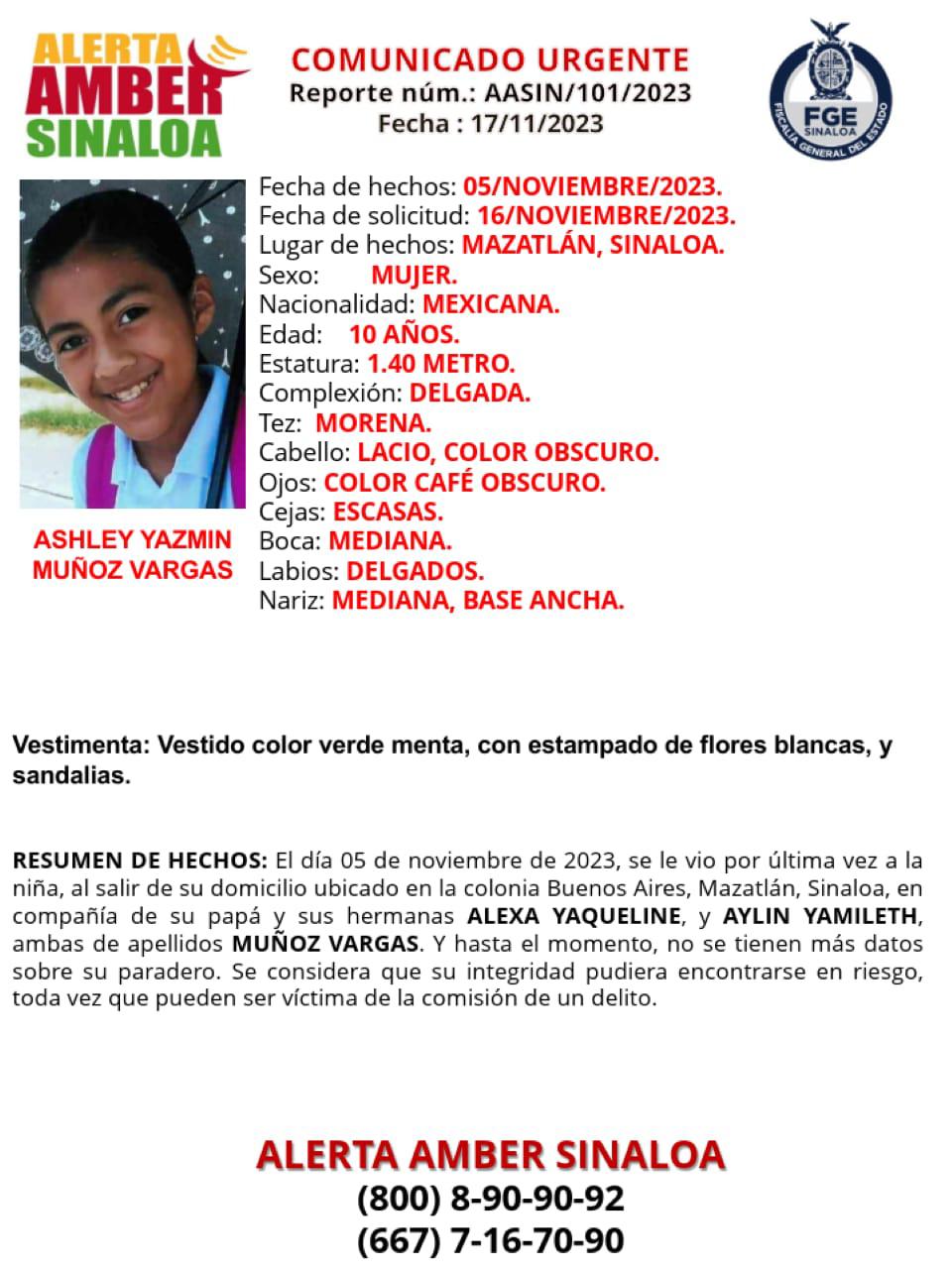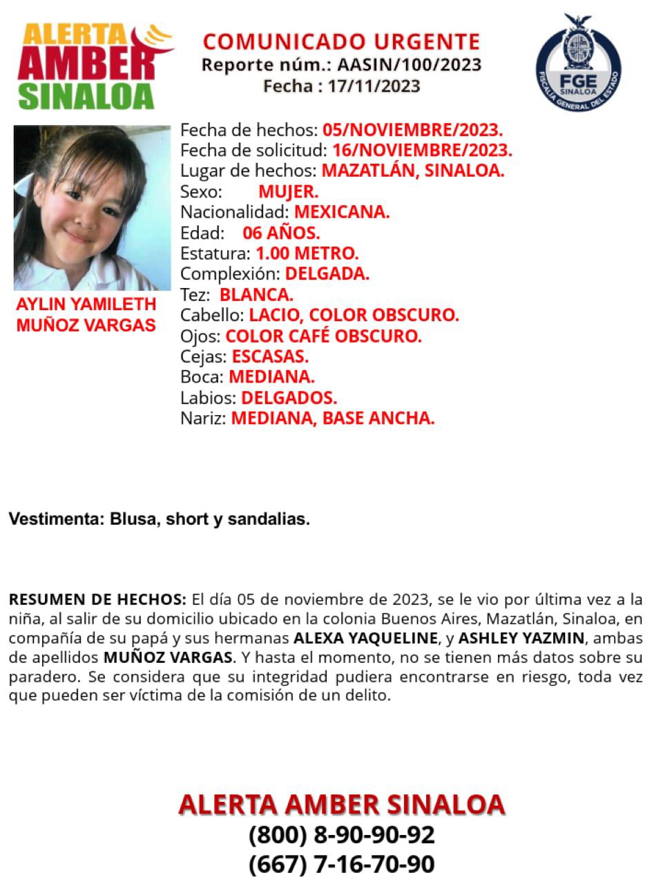 La Fiscalía de Sinaloa señala que hasta el momento no se tienen más datos de su paradero y considera que su integridad pudiera encontrarse en riesgo, toda vez que pueden ser víctimas de la comisión de un delito.