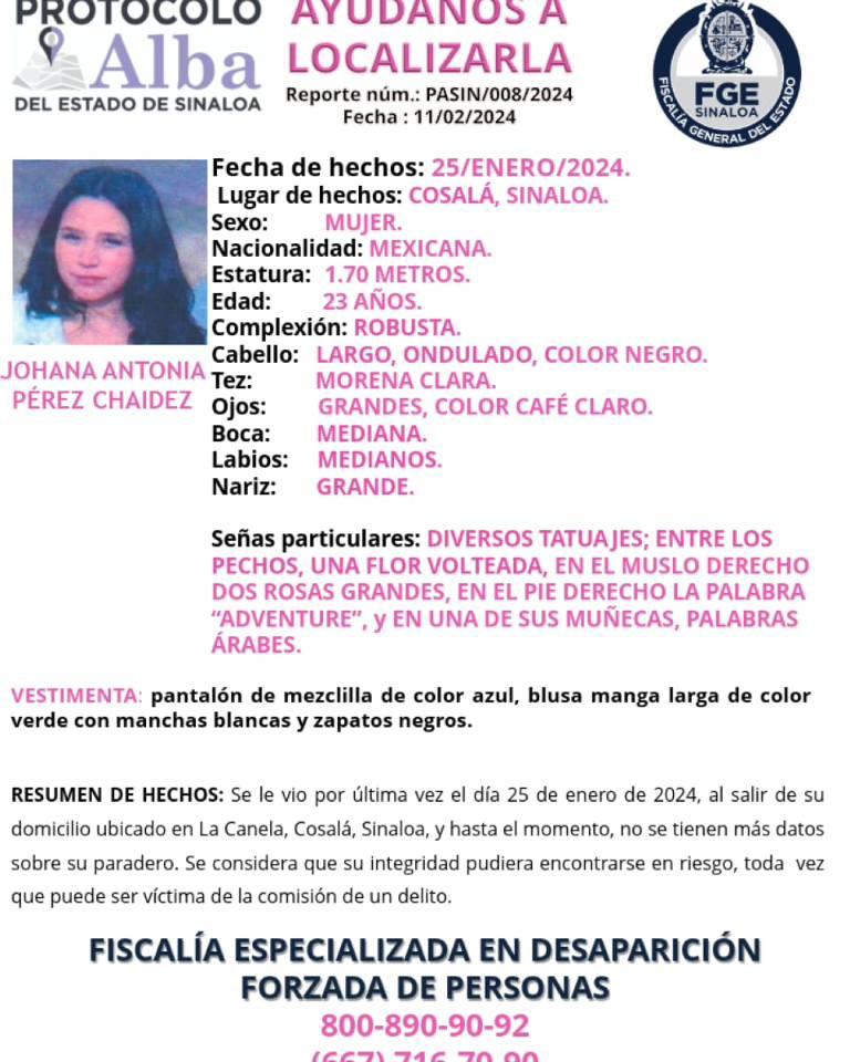 El día 25 de enero del 2024, Johana Antonia Pérez Chaidez salió de su domicilio ubicado en la Canela, Cosalá, Sinaloa, y ya no se ha vuelto a saber de su paradero.
