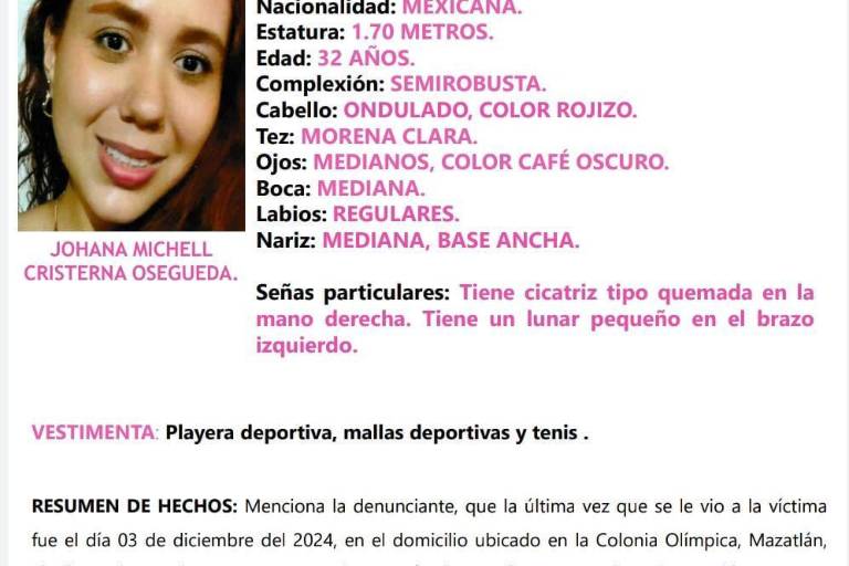 MAZATLÁN._ Luego de que la Fiscalía General del Estado de Sinaloa solicitó el apoyo para encontrar a Johana Michell Cristerna Osegueda, de 32 años de edad y quien se encontraba desaparecida en Mazatlán, se reportó su localización.