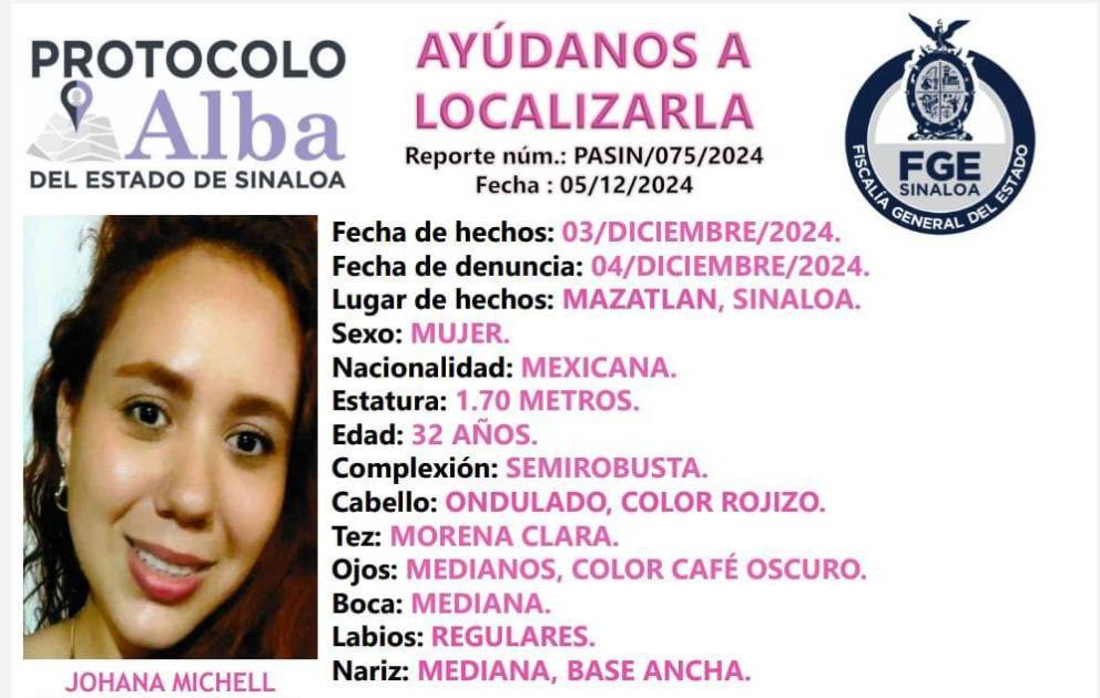 La FGE había emitido el jueves 5 de diciembre el Protocolo Alba del Estado de Sinaloa con el reporte número PASIN/075/2024 por su presunta desaparición.