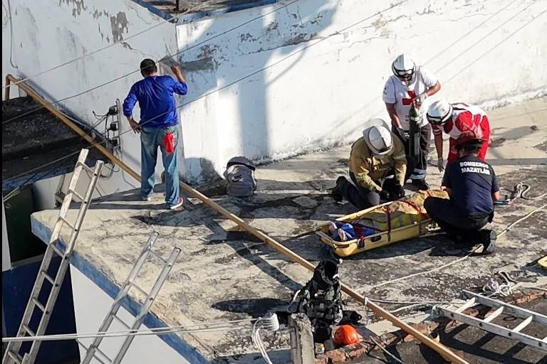 Socorristas de Cruz Roja fueron los primeros en llegar al lugar y después valorar al lesionado solicitaron el apoyo de Bomberos Mazatlán, para bajarlo del techo.