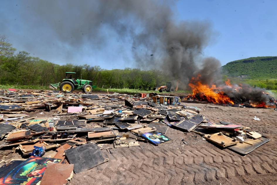 El Gobernador Rubén Rocha Moya encabezó la incineración de más de 3 toneladas de droga y la destrucción de objetos relacionados con actividades ilícitas, incluidos mil 652 equipos de videovigilancia clandestinos, en un evento realizado este martes 23 de julio en el ejido Los Becos, al sur de Culiacán.