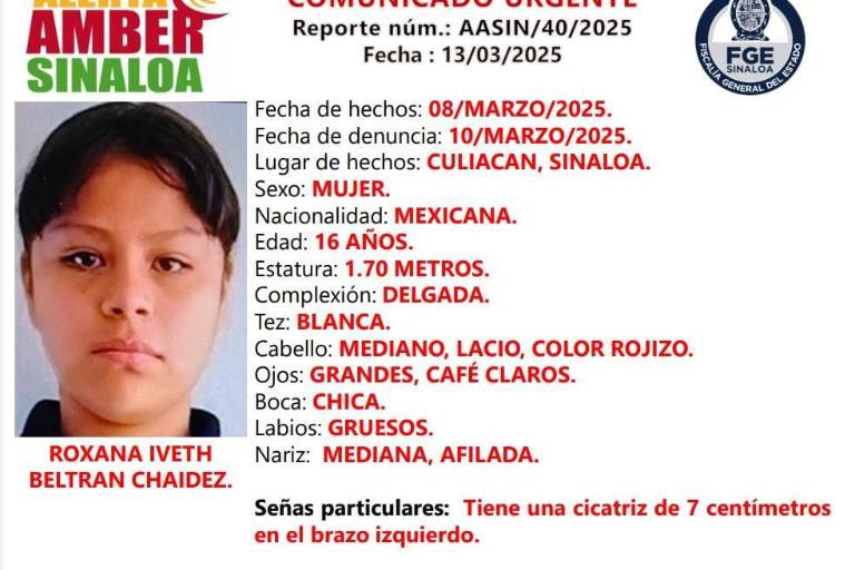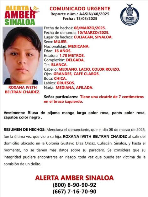 CULLIACÁN. _ La Fiscalía General del Estado de Sinaloa ha emitido una Alerta Amber para localizar a Roxana Iveth “N”, de 16 años desaparecida desde el 8 de marzo de 2025 en Culiacán.