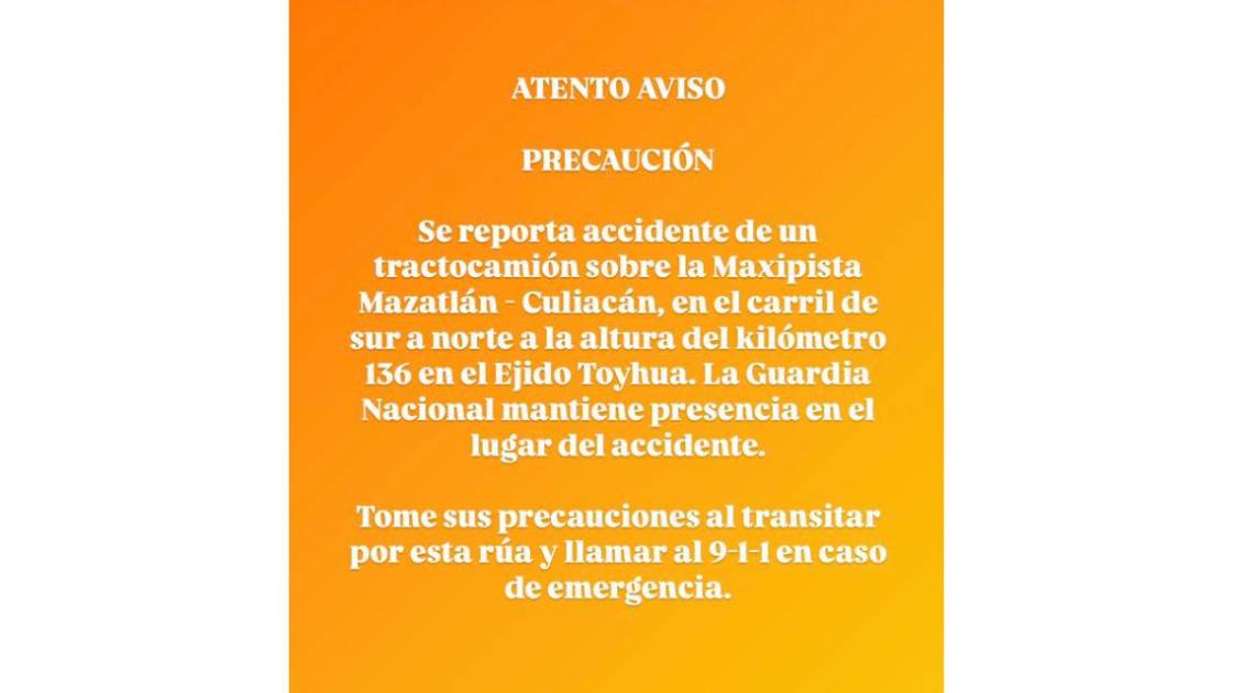 Protección Civil de Sinaloa informó que elementos de la Guardia Nacional se encuentran en el lugar para resguardar la zona del accidente