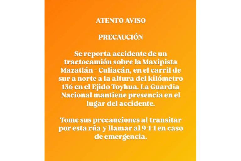 Durante el mediodía de este viernes se registró un accidente de un tráiler sobre la autopista Mazatlán-Culiacán, por lo que quienes transitan por ahí deben tomar precauciones.