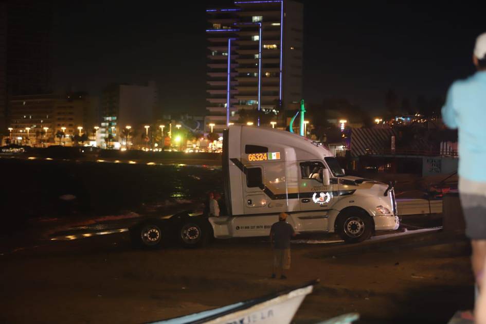 MAZATLÁN._ En una acción insólita, un tráiler de una empresa de paquetería nacional, con sucursal en Mazatlán, quedó atorado la noche de este miércoles en plena Playa Norte, a unos metros de las pangas de los pescadores.