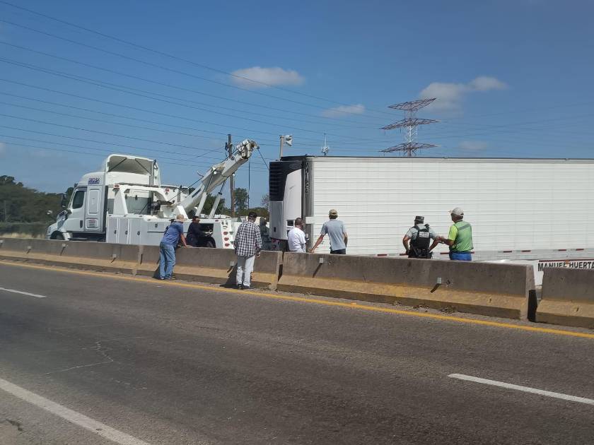 Tras el incidente, la caja quedó sobre el pavimento, obstruyendo completamente los carriles, lo que generó la movilización de elementos de la Guardia Nacional para controlar la circulación y evitar otro percance.