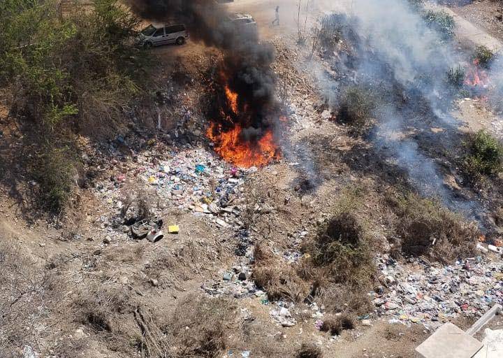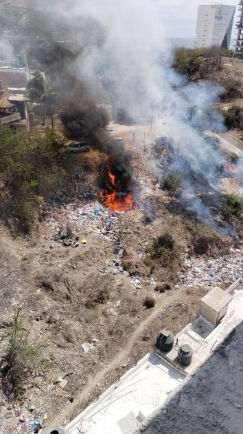 Bomberos Mazatlán con su personal a bordo de las unidades 73 y 74 acudió a sofocar el incendio del lote usado como basurero, ubicado entre el antiguo templo y el llamado barranco.