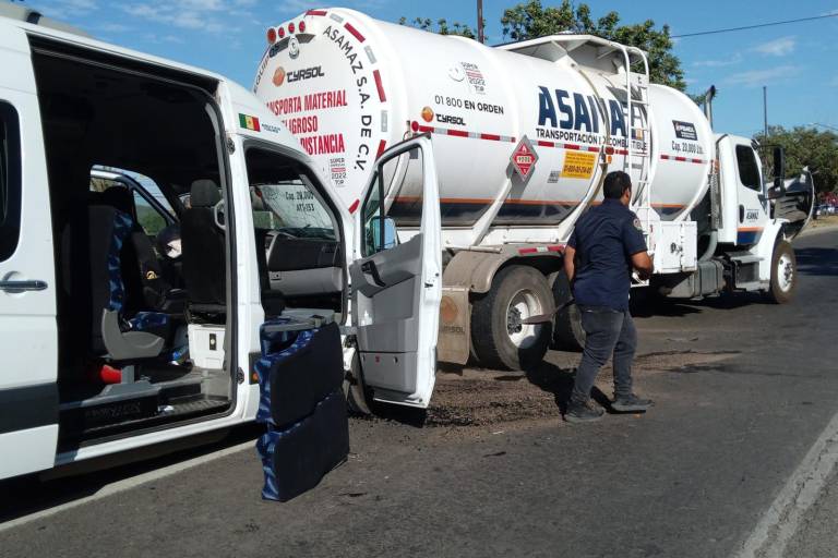 Por prevención, los automovilistas que circulaban en esos momentos sobre los carriles hacia el sur, detuvieron la marcha de manera brusca, una camioneta MG RX5 nueva, que era trasladada hasta un patio de resguardo, fue impactada por una pipa de transporte de combustible y sobre la defensa trasera de la pipa se impactó una Van Sprinter Mercedes Benz que transportaba personal de una empresa ubicada en el Parque Industrial Mazatlán.