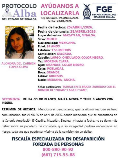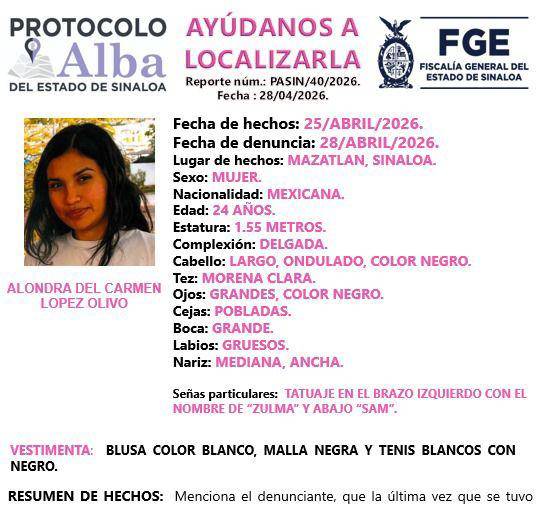Fue reportada como desaparecida Alondra del Carmen López Olivo, joven vista por última ocasión el pasado 25 de abril, en el municipio de Mazatlán.