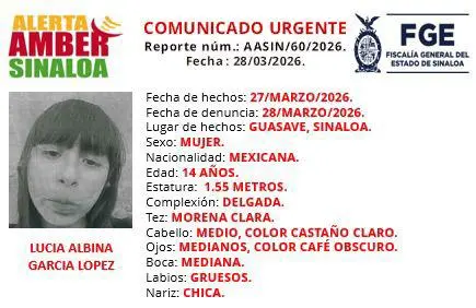 La Fiscalía General del Estado de Sinaloa activó una Alerta Amber para solicitar apoyo para localizar a Lucía Albina García López, de 14 años de edad, desaparecida en Guasave.