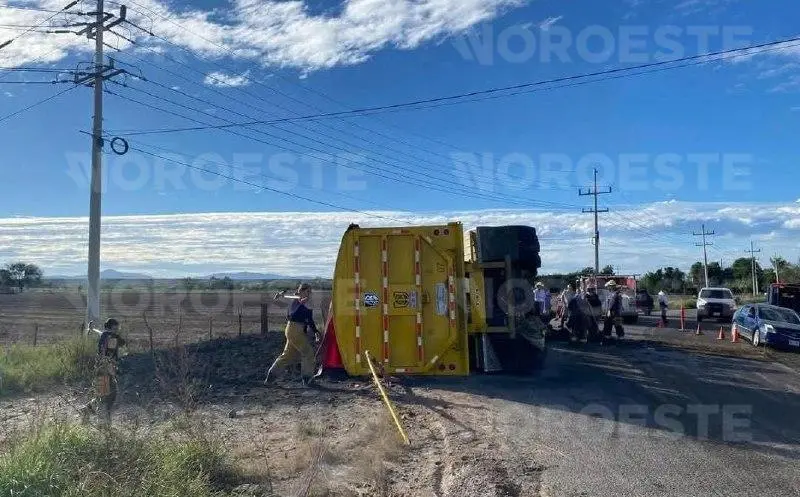 EL FUERTE._ Un operador prácticamente ileso y daños materiales fue el saldo que dejó la volcadura de un camión de carga registrada durante la tarde del viernes sobre la carretera estatal que comunica la cabecera municipal de El Fuerte con el Valle del Carrizo.