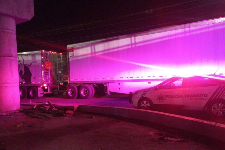 La unidad de doble remolque presuntamente quedó atrapada debido a la falta de señalamientos que indicaran las condiciones del cruce bajo el puente