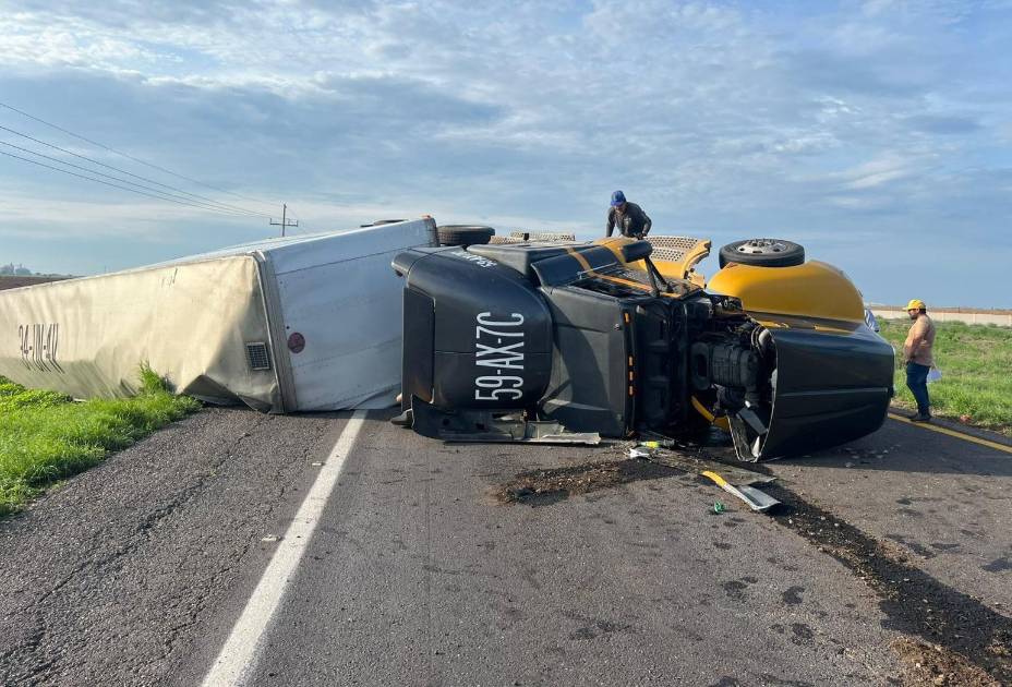 ELOTA. _ Un tráiler volcó y quedó atravesado en los carriles con dirección sur a norte de la autopista Mazatlán–Culiacán, a la altura del kilómetro 94, cerca del entronque a La Cruz de Elota.