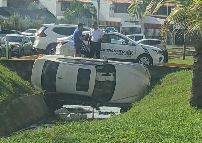 MAZATLÁN._ Un automóvil BMW quedó volcado sobre su costado derecho en un canal pluvial de la avenida La Marina, tras recibir un impacto de otro vehículo cuyo conductor se dio a la fuga.
