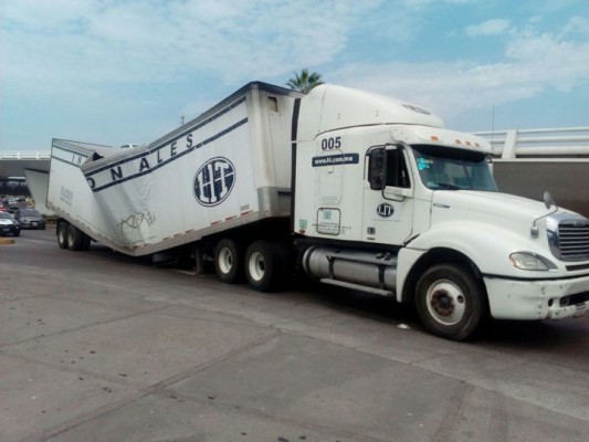 La mujer se llevó la unidad a Culiacan, y al llegar al Puente Negro no calculó la altura y el tráiler quedó atorado.