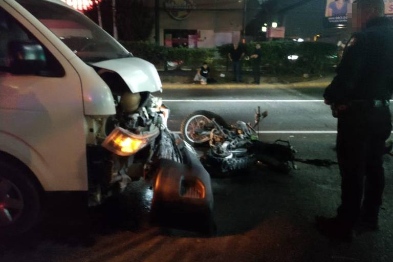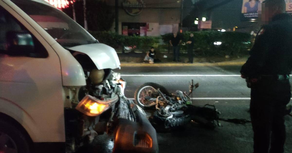 El conductor de una motocicleta Italika DM200 saltó de su unidad al percatarse de que la van se acercaba sin disminuir su velocidad, acción que le salvó de sufrir graves lesiones o incluso perder la vida, ya que su moto quedó destrozada por el impacto.