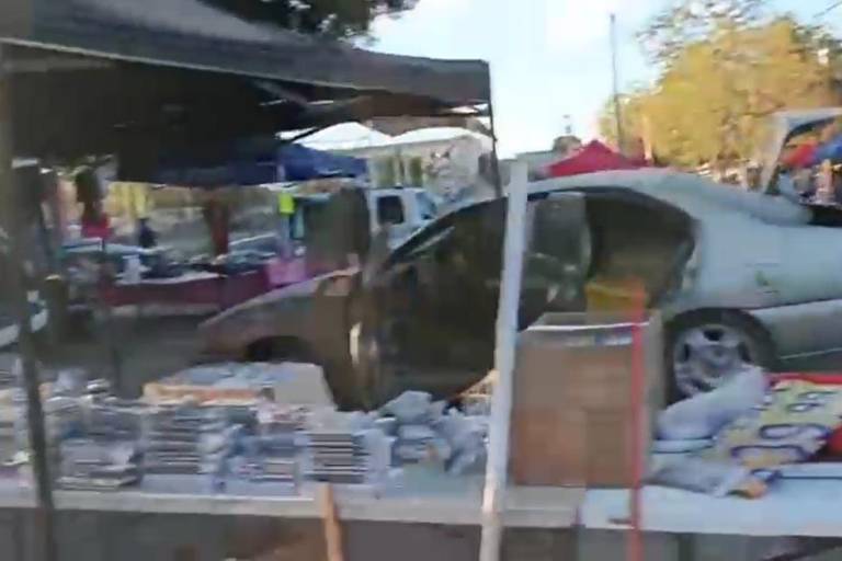 CULIACÁN._ Un hombre a bordo de un vehículo irrumpió en el Tianguis de Lombardo Toledano, en Culiacán, y dejó el saldo de dos personas lesionadas y daños materiales tras estamparse con varios puestos del lugar durante la mañana de este sábado.