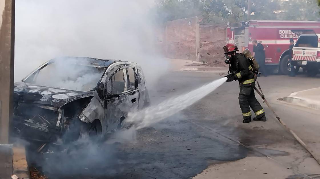 CULIACÁN. _ Un vehículo terminó completamente calcinado la tarde de este lunes, luego de que su conductor lo estrellara contra un poste de alumbrado público en la colonia El Vallado, al sur de Culiacán.