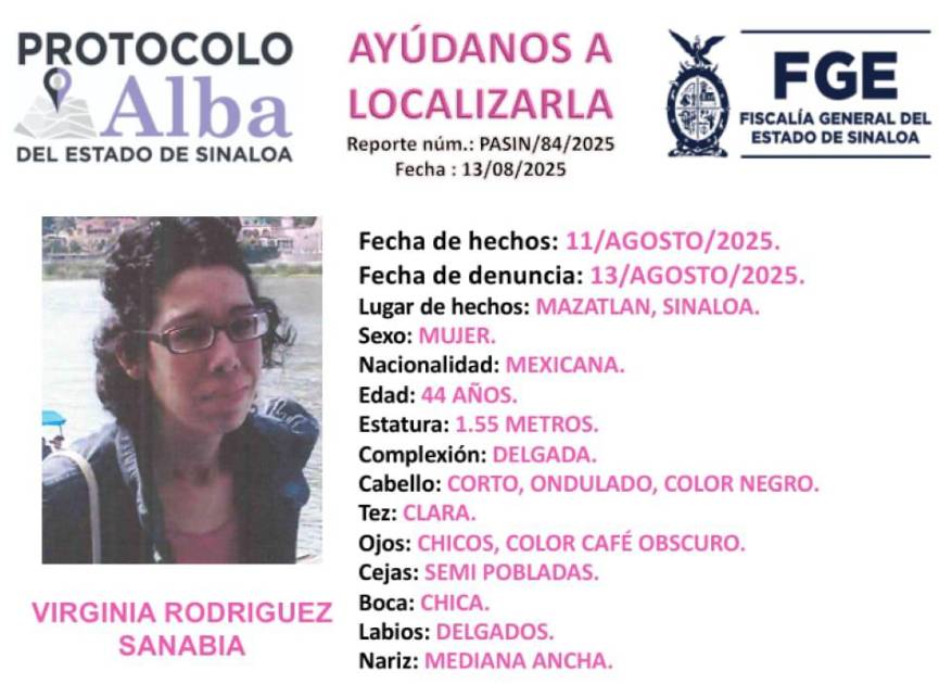 La Fiscalía General del Estado de Sinaloa activó el Protocolo Alba para localizar a Virginia, de 44 años, reportada como desaparecida en Mazatlán desde el pasado 11 de agosto.