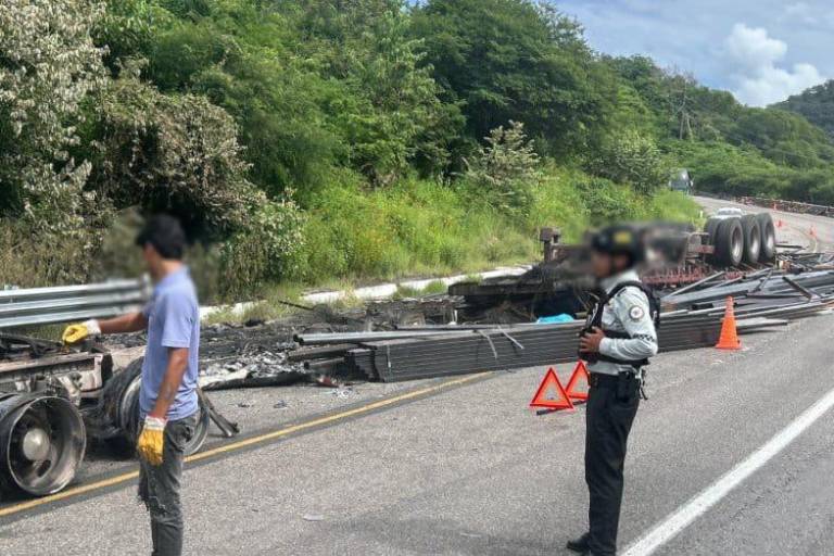 El transporte cargado con toneladas de perfiles de acero, volcó en una curva luego de aumentar su velocidad por una falla en el sistema de frenos. Tras la volcadura, el derrame del tanque de combustible provocó el incendio del tractocamión; el conductor no logró salir de la cabina y murió carbonizado.