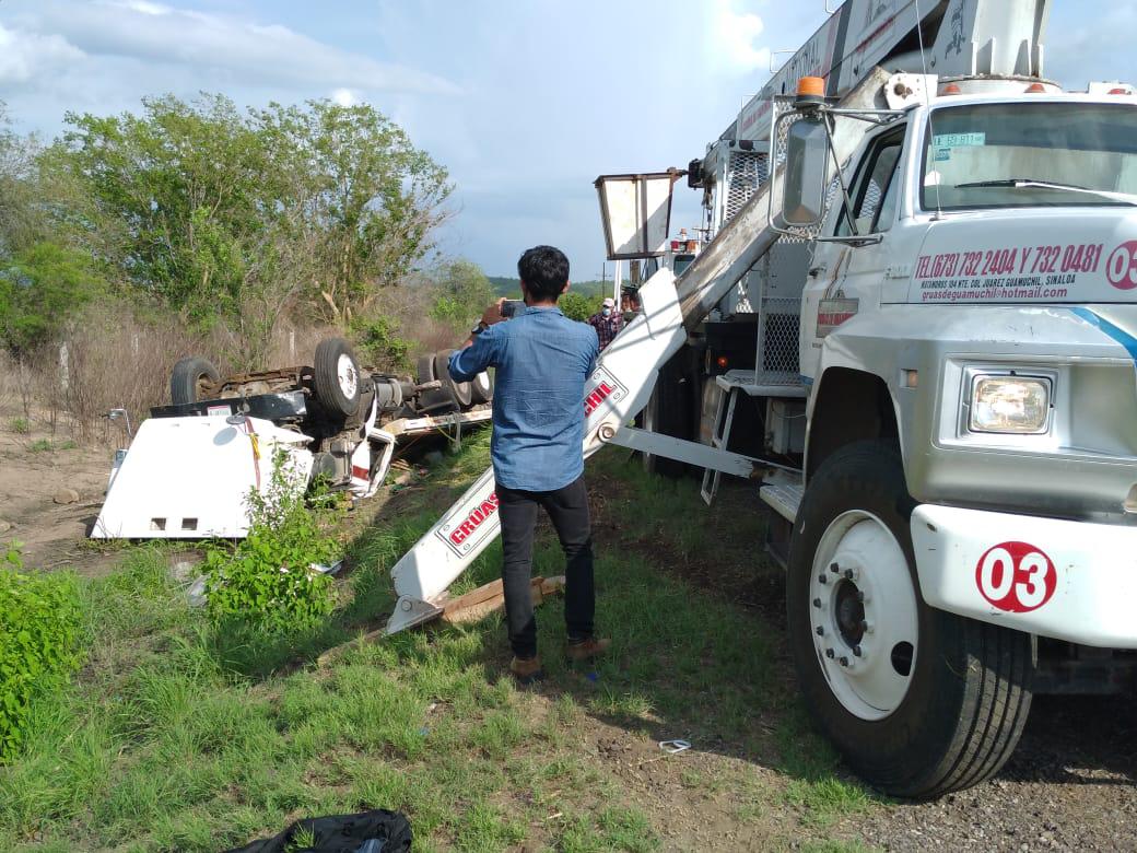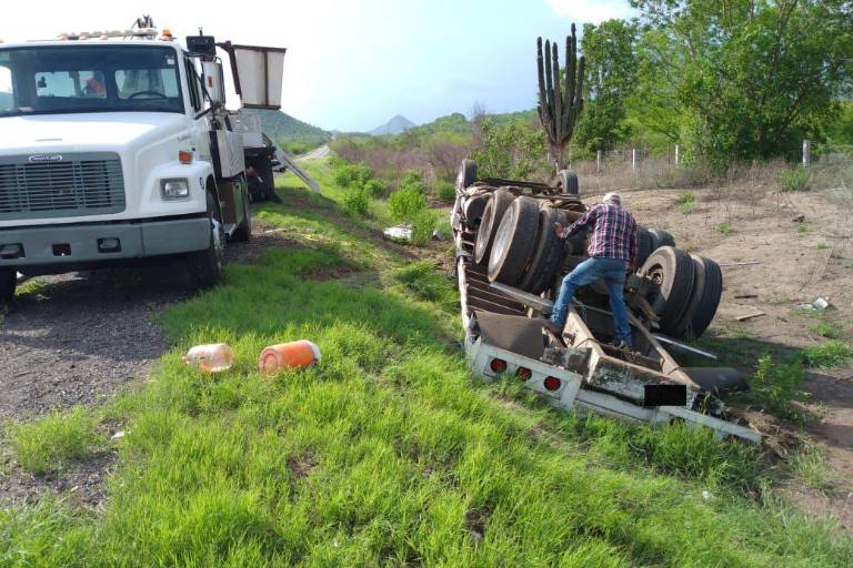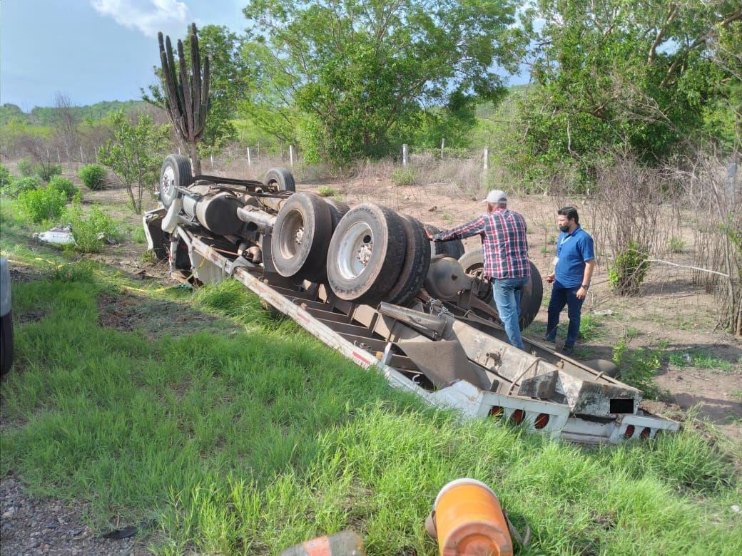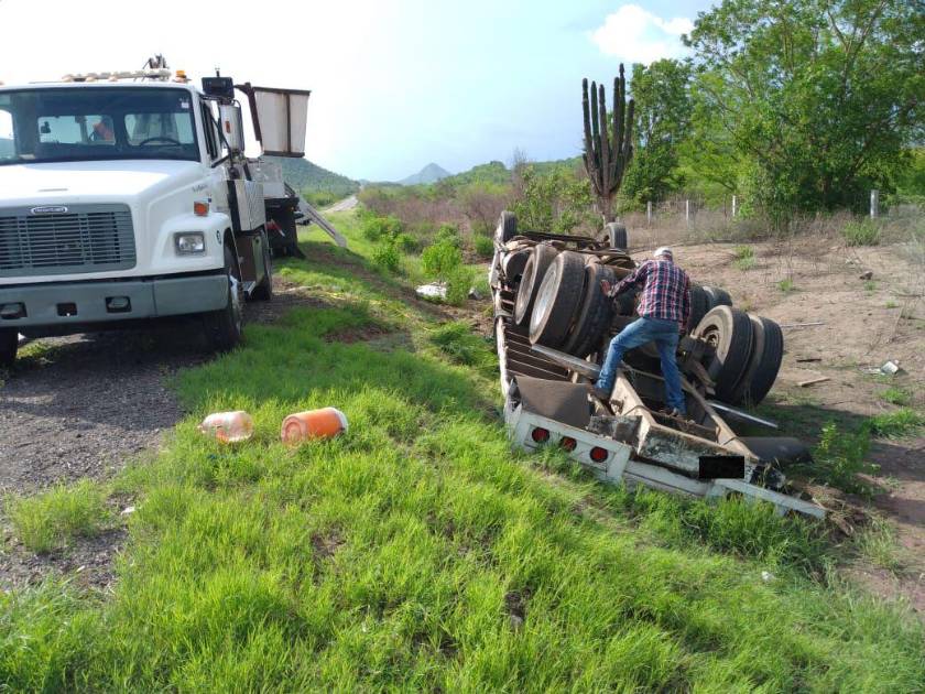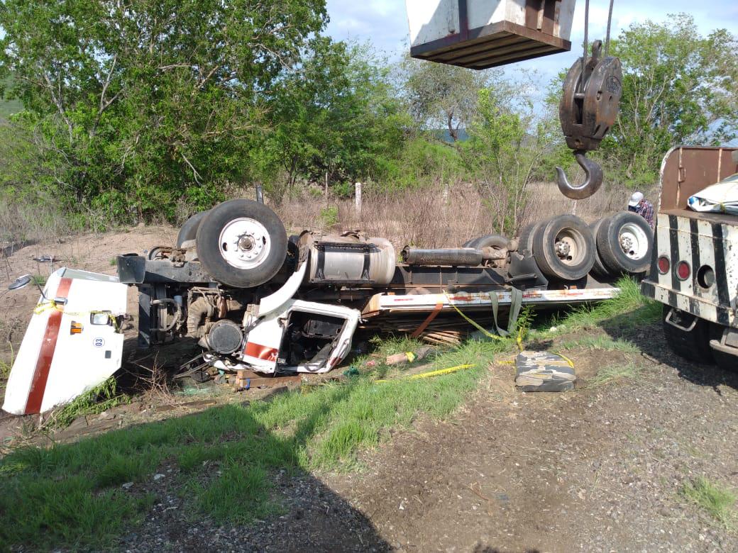 MOCORITO, Sin._ Un muerto y tres personas lesionadas fue el resultado de la volcadura de un camión de carga tipo torton la tarde de este sábado, en el kilómetro 67 de la carretera México 15, en las inmediaciones del poblado de Tóbora, sindicatura de Pericos, Mocorito.