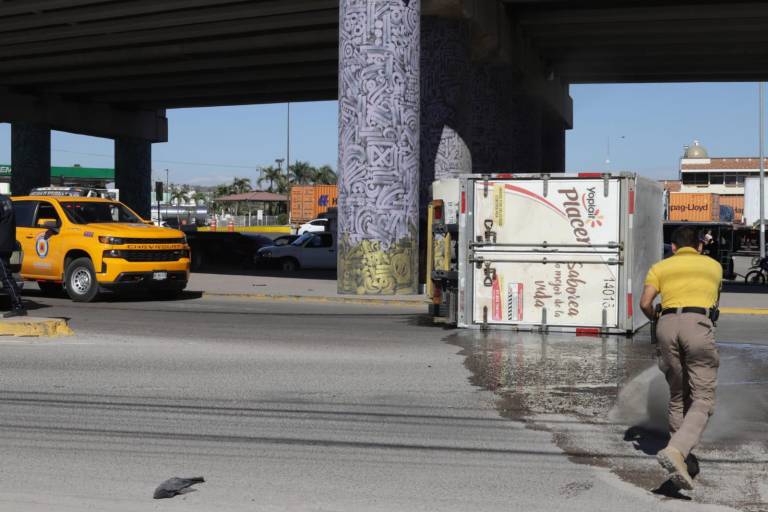 MAZATLÁN._ Un camión de una empresa de lácteos volcó en la lateral del Paso Superior Sur, su conductor resultó ileso.