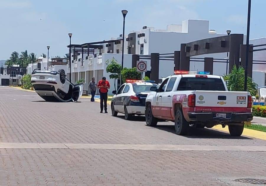 MAZATLÁN._ Con las llantas hacia arriba terminó una camioneta de lujo, de color blanco, en el interior del fraccionamiento Montecarlo, luego de que al parecer su conductora perdiera la dirección del volante.