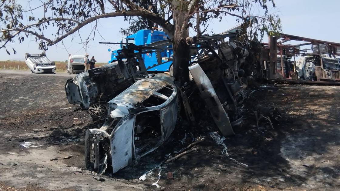 Según reportes preliminares, en el tráiler viajaban el conductor y un pasajero, quienes se dirigían de sur a norte cuando, por causas aún no determinadas, perdieron el control de la unidad, salieron de la cinta asfáltica y se volcaron sobre la terracería. La pesada unidad terminó de costado, provocando un incendio de gran magnitud que consumió completamente la nodriza y siete de los vehículos que transportaba. Otros dos automóviles tipo sedán, aunque no se incendiaron, resultaron siniestrados tras quedar fuera de la plataforma y con severos daños en su carrocería.
