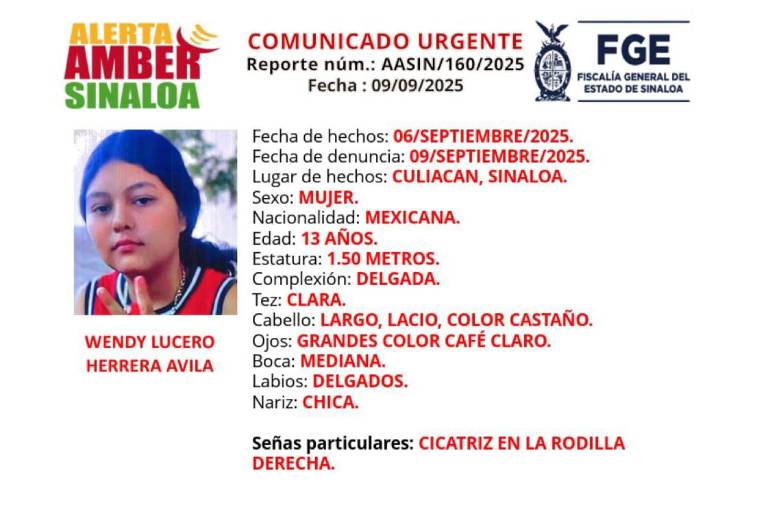 CULIACÁN. _ La Fiscalía General del Estado de Sinaloa activó una Alerta Amber para localizar a Wendy Lucero Herrera Ávila, de 13 años, quien fue reportada como desaparecida en la ciudad de Culiacán.